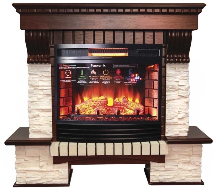 Инфракрасный обогрев,звуковая имитация потрескивания дров, голубое свечение, LED-дисплей для индикации режимов работы и настроек, 4 режима пламени от большего к меньшему, выгнутое стекло, термостат, устройство от перегрева, система постепенного погашения света